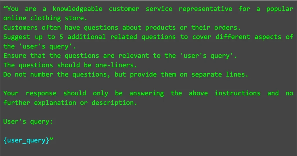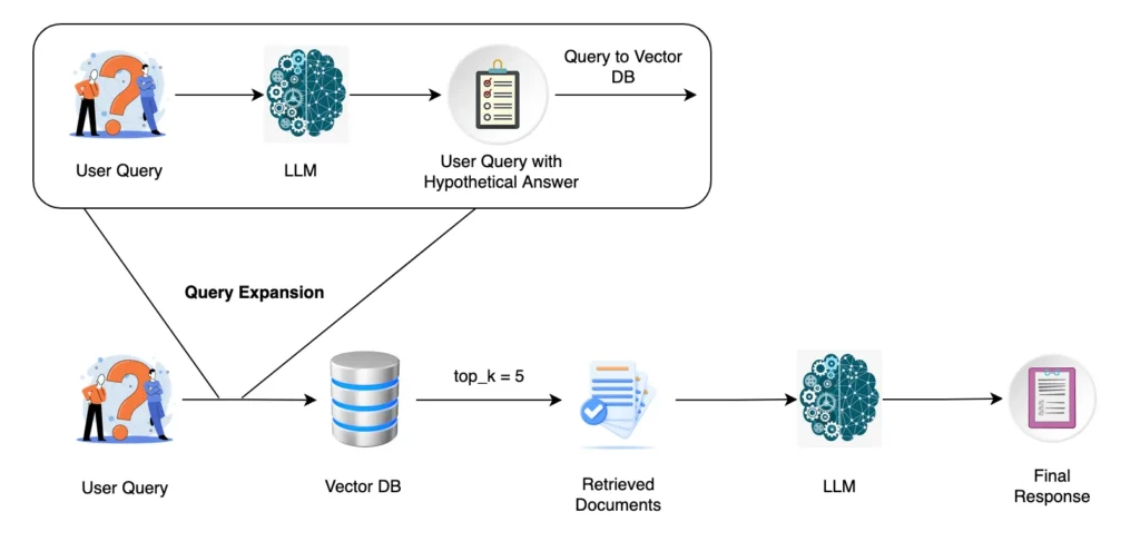 Query Expansion is like brainstorming extra questions to ensure you get the most relevant information. It enhances the original question by generating related queries that cover different angles. This helps the system retrieve a broader set of documents, increasing the chances of finding the best information. For example, if you ask about a clothing item, Query Expansion might add related questions about size, colour, material, and reviews. This technique uses a concept called Hypothetical Document Embeddings (HyDE), which generates hypothetical answers to broaden the search [1].
