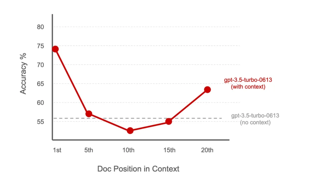 2. N. Liu, K. Lin, J. Hewitt, A. Paranjape, M. Bevilacqua, F. Petroni, and P. Liang, “Lost in the Middle: How Language Models Use Long Contexts”, 2023.