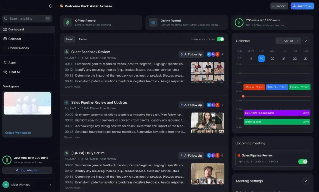 - Meeting Management Features: Developed functionality for viewing meeting history, summaries, notes, and action items, with email and Slack notifications.